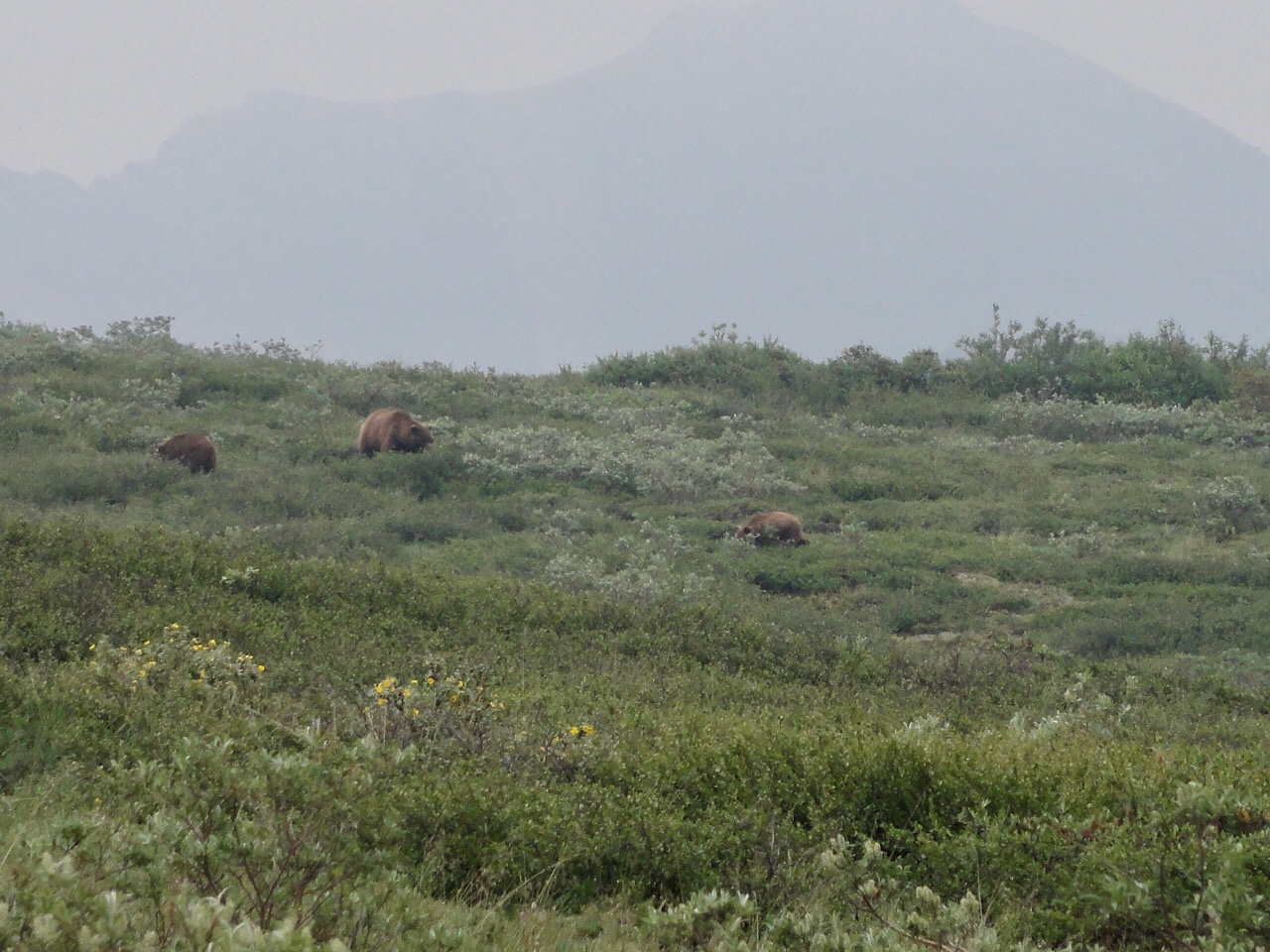 This morning we got up at 5:00 am to get ready for our shuttle bus tour. The bus left the bus stop at 5:45 am, and you had to be on time. The bus tour was pretty good. The tour we chose was the all day tour that took us on 92 miles of dirt road. There were several stops on the road to look at the beautiful views or the wildlife. We saw a sow grizzly and two cubs with in the first hour or two.