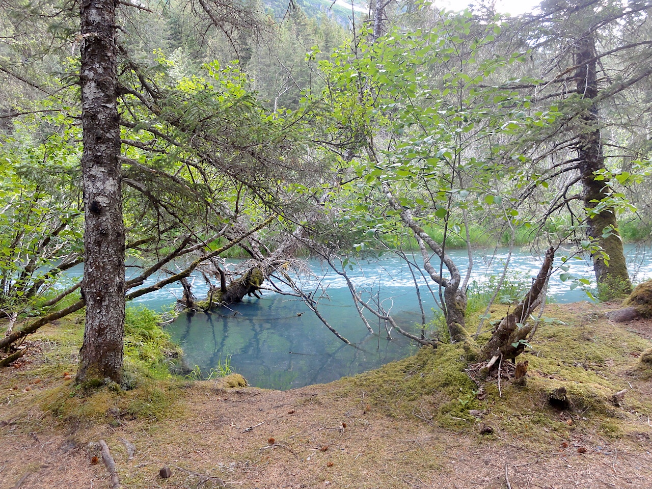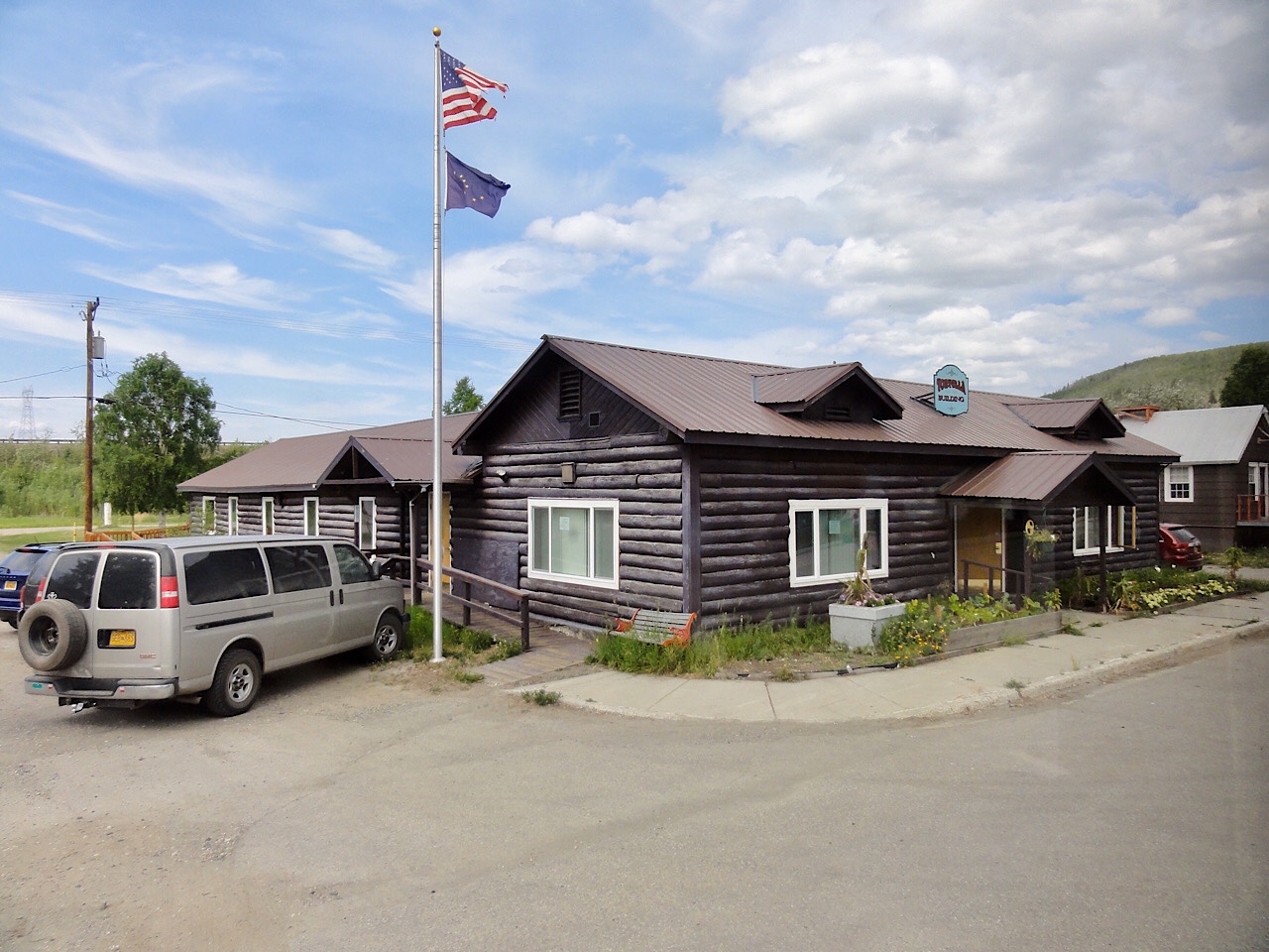 It was Sunday and time to drive south back towards Anchorage. We slept in this morning and left Fairbanks at around 11:00 am. It took us about 1/2 hour to fill with water and find a dump to empty our tanks. We drove to Nenana to go to church, and arrived about 11:45 am. This is a small town 58 miles south of Fairbanks. We got there early so we could change into our church clothes. The church was in a small building on the main road into town. It looked like they only used half of the building. We walked up to the door at 5 minutes before noon and the doors were locked. We thought that maybe it was stake conference, so we got back into the motorhome and drove around town. We came back about 10 minutes later and we saw a couple of cars pulling up to the building. It looks like they were a little flexible on starting times.