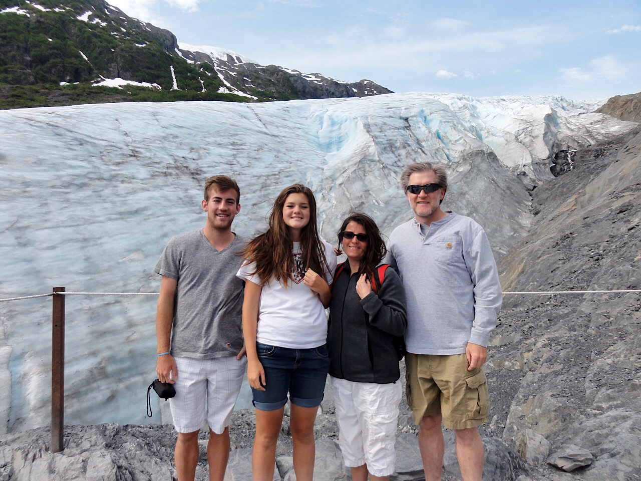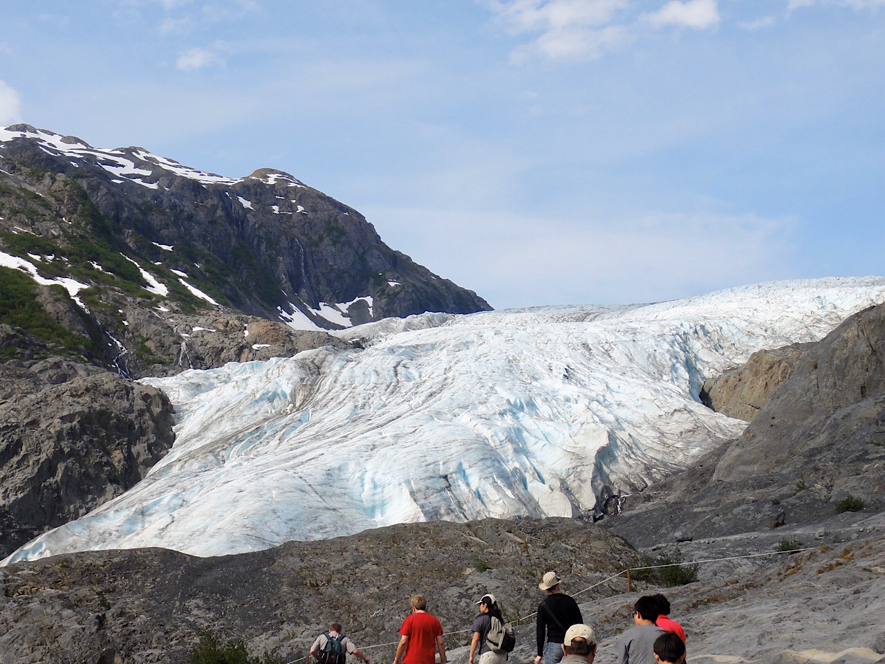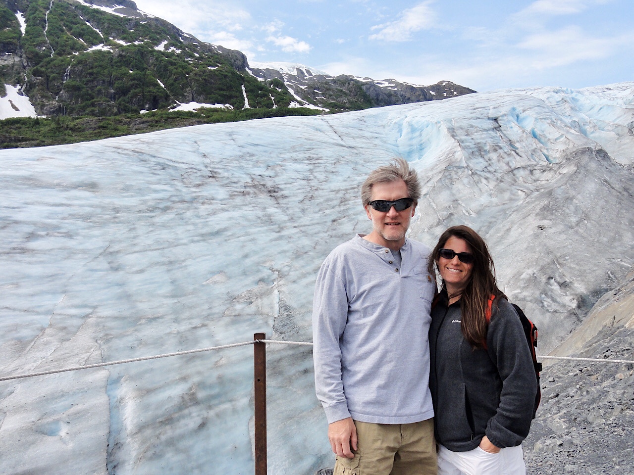 This morning we got up and everyone showered. It was a windy day, but it was sunny and warm. We dumped the RV tanks at the Seward city dump and then drove 20 minutes to Exit Glacier. We had scheduled the 10:00 am Ranger tour. The tour was a 1-1/2 hour. The ranger did a good job telling about the glacier and the area. We hiked up the mountain to the glacier. It is amazing the colors of the ice and the tunnels and cracks through the ice.