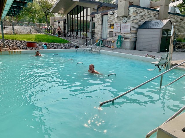 We arrived in Thermopolis around 10 am and stopped at the State Bath House. They have a couple of hot mineral pools to soak in for free. They only give you 1/2 hour to soak in the 104 degree water. That was plenty of time for us and it felt pretty good. It was also nice to take a real shower and get cleaned up.