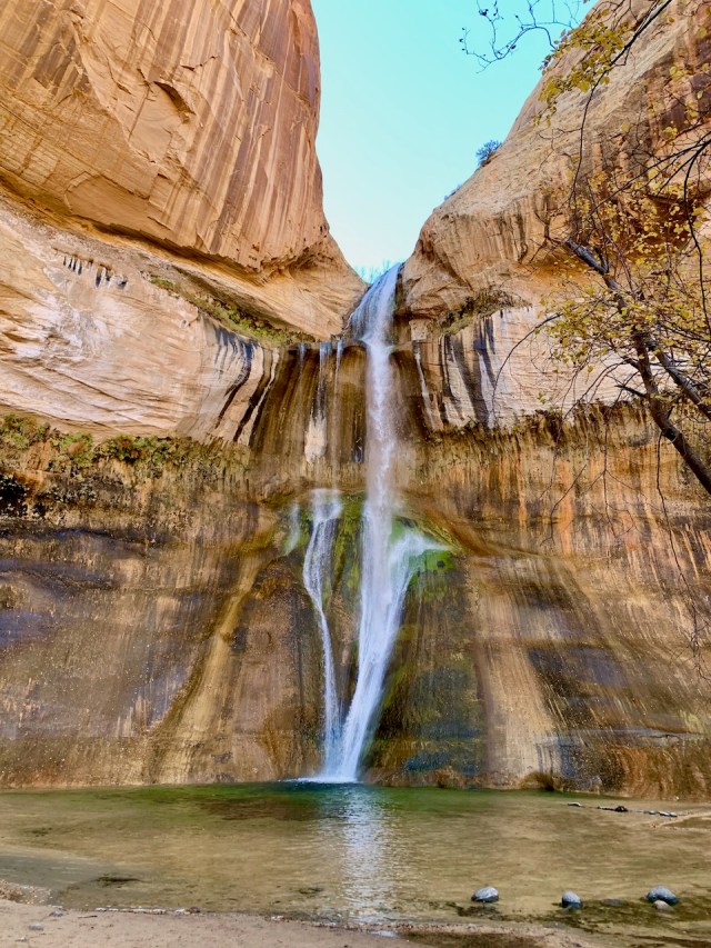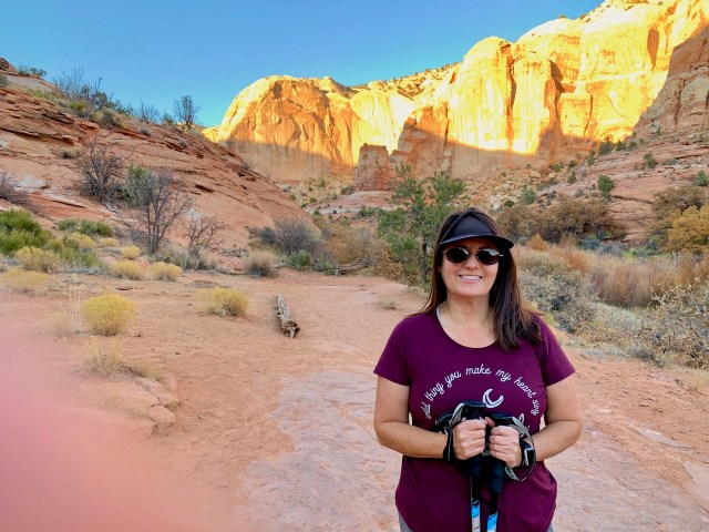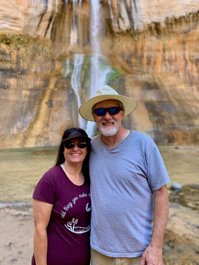 We changed plans and continued up Hwy 12 to Calf Creek Campground. We were lucky and there were several campsites available for $15/night. We snagged a site and setup camp. We ate lunch and then started the hike to the Calf Creek Waterfall. It was a 6 mile round trip, but 5-1/2 miles of the hike was deep soft sand, so it was a difficult hike. We started late in the day, so we passed a lot of people coming down the trail. It took about 1-1/2 hours for us to get to the waterfall. After taking some pictures, I tried to talk Eva into jumping into the pool of water, but she wouldn’t go for it. About 15 years ago I did this hike with the kids. It was a hot, middle of the day hike. When we got to the waterfall we all jumped into the pool of water. I dove in, head first. The water was freezing cold. So cold that it gave me a headache the minute I dove under the water.