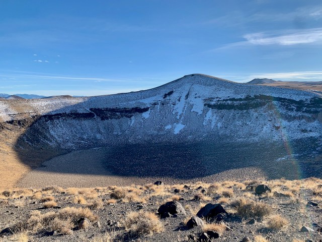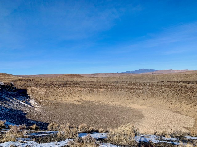 About halfway to Tonapah we set up camp at the Lunar Crater, about 7 miles off the highway. The “Lunar Crater” is actually an old volcanic crater, but it is deep and round and looks like a meteor could have hit there and created it. It is several hundred feet deep and probably over a half mile wide. We drove around the top and camped on the southeast edge of the rim. It was a nice night with no wind and not too cold. We had Wontons and sticky rice for dinner and watched a movie later in the evening.