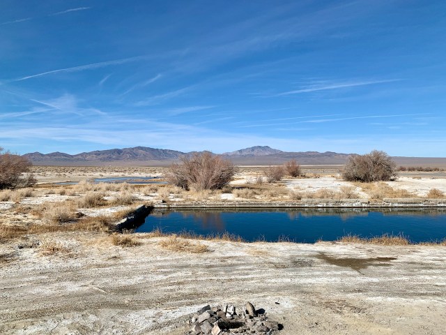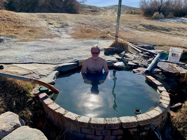 We talked to a guy that volunteers to maintain the site. He told us the owner lives in LA and doesn’t mind people using the tubs. He was cleaning up the area and placing some flat rocks around the two tubs. The hot spring comes out of a hill in a 4” pipe that feeds two concrete/brick tubs. Each tub held about 3-4 people. The skies were sunny and warm, and just as we got in the water a young lady arrived and asked if she could join us. She is an environmental engineer that was working in Vegas and was heading home to Reno, but stopped to soak in the water. We stayed and talked to her for 30-40 minutes when other people showed up. So we got out and went back to our vehicles. The water was a perfect temperature and it made my sore back feel great.