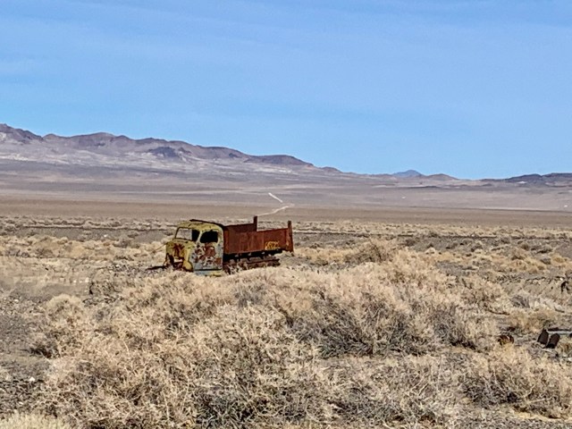 Nothing interesting along I-80, except the “Tree of Life” and the Salt Flats. We had seen both, so no need to stop. From Wendover we turned southwest and continued through Ely, NV. Leaving Ely, we were on Highway 6. They claim that Highway 50 across Nevada is the loneliest highway in America, but Highway 6 was more lonely for us. We drove the 170 miles between Ely and Tonapah and only saw 6 vehicles.