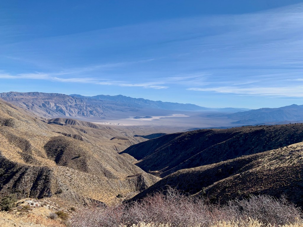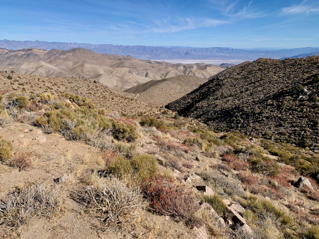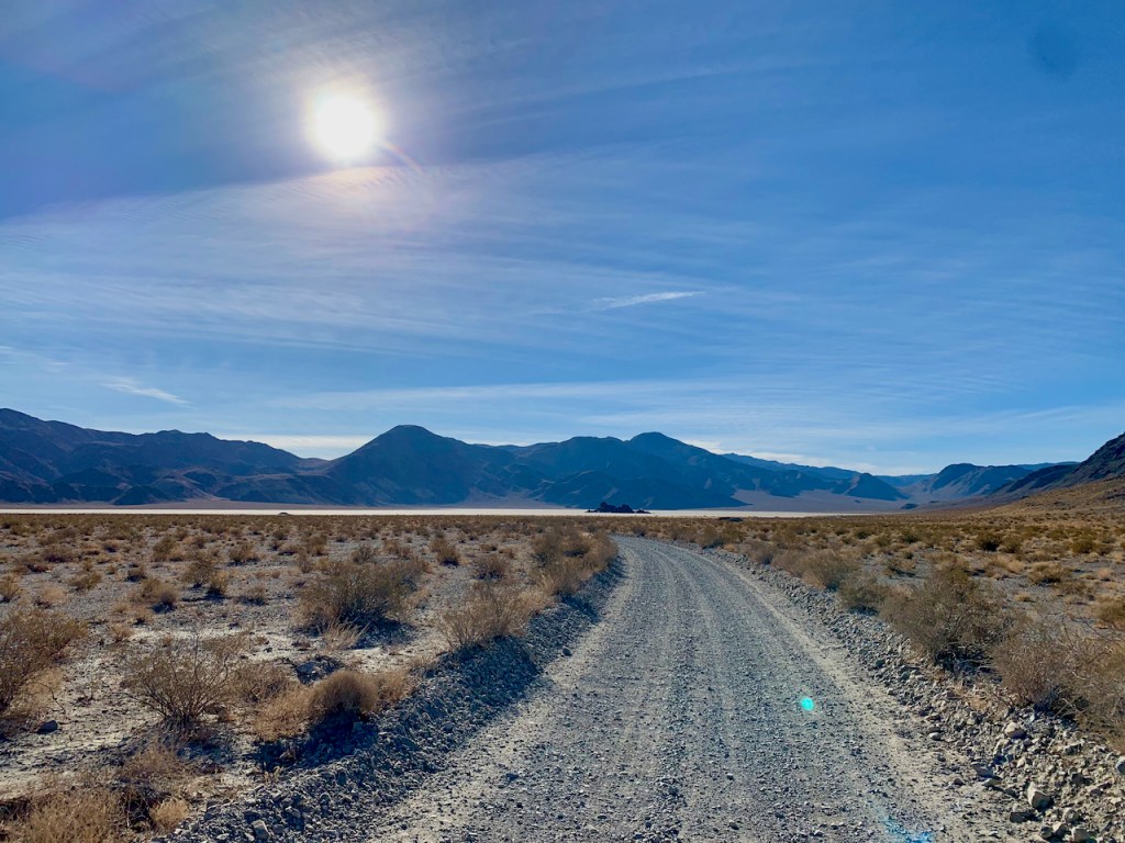 We drove back to Teakettle Junction and turned west on Hidden Valley road to find our way out of this northern part of the park. It was a beautiful ride through canyons and valleys. The trail ends with a steep narrow road across a couple of mountain ranges. There were many switchbacks and steep areas, but the road surface was pretty smooth so it was a fun ride. Once over the mountains we descended into Saline Valley and back to the paved road. Our drive across the northern part of Death Valley was two days long and ~150 miles of driving with only 24 miles that were paved. We saw very few people and we saw a lot of beautiful desert valleys and mountains.