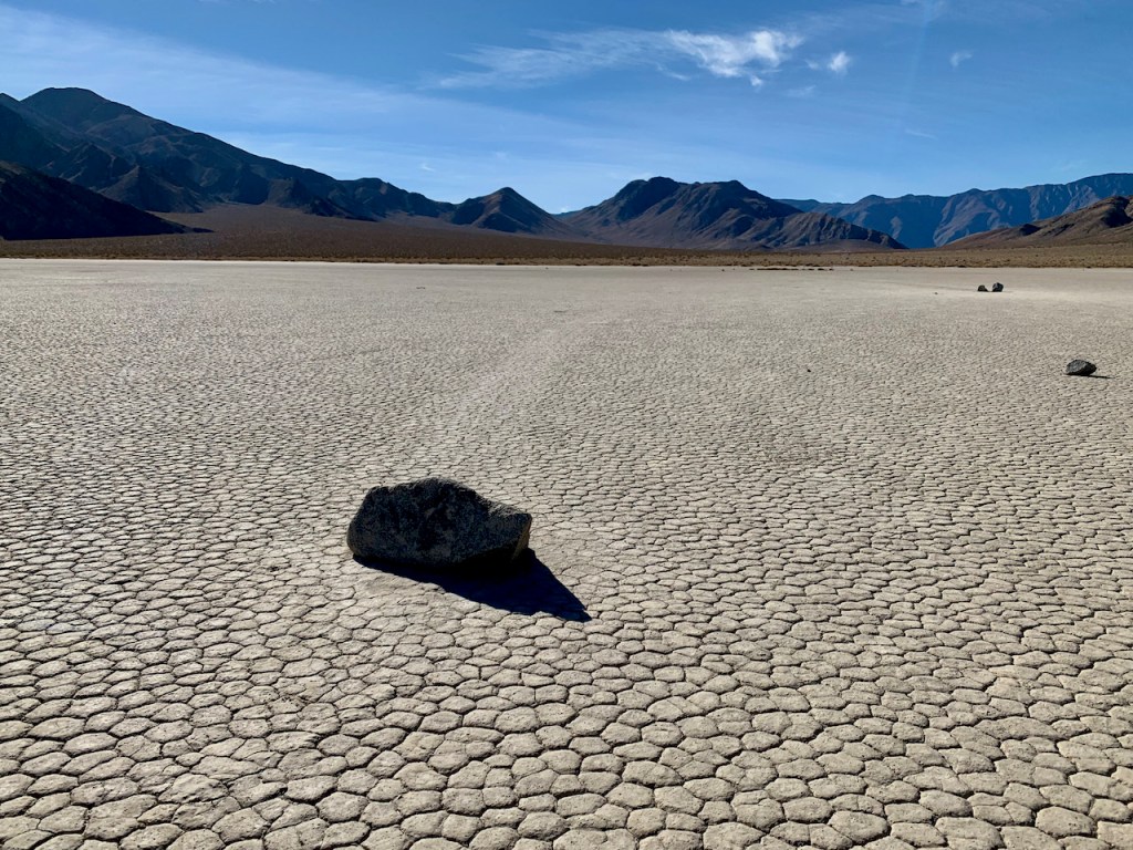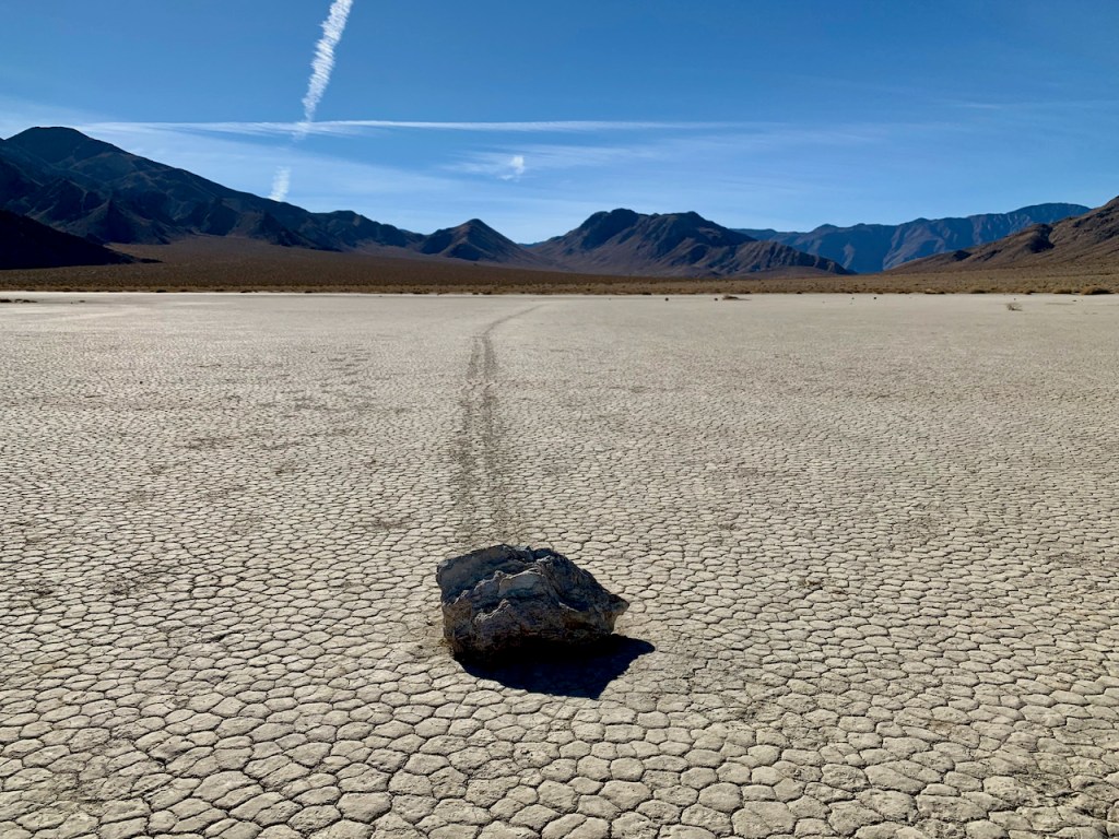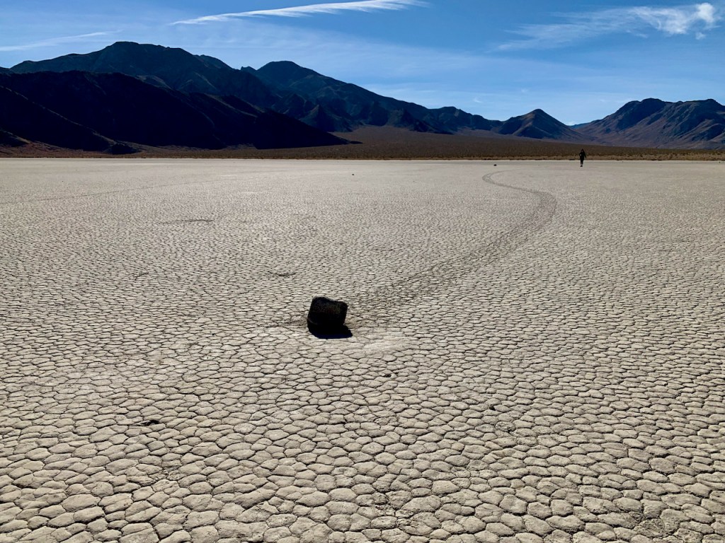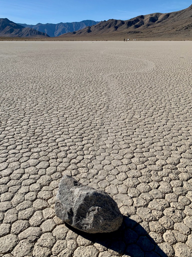 The real reason we came to the Racetrack is to see the magic sliding rocks. I had heard of this place probably 10-15 years ago and wanted to visit here ever since. The south end of the Racetrack has rocks that slide across the playa. The rocks leave distinct weaving trails across the flat lake bed.