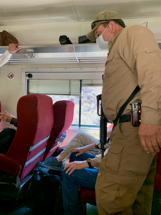 The train’s interior was not in great shape, but not too bad. At least the air conditioning worked well as the temperature rose as we descended the mountains. The train had several vendors selling food and at least 3-4 armed guards (sidearms and AR-15) to protect us from the banditos (drug cartels). There was also a guy that would go from car to car singing a song about El Chepe.