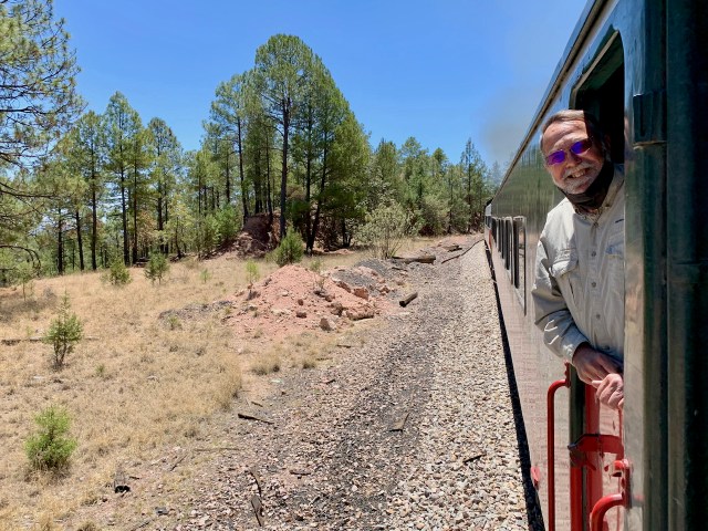 During much of the ride many of us stood on the platforms between the cars. This was the most exciting spot to stand and hang your head out the window to look at the train and the scenery. You had to be careful and watch for limbs and branches that hung close to the train. The rock cliffs and tunnel walls were also only a few feet away as we sped by. A few of the tunnels were over a mile long and we were in total darkness for a few minutes.