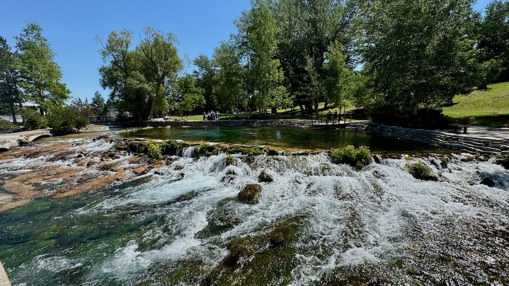 We did a short hike to Big Spring, one of the largest freshwater springs in the county. It feeds millions of gallons a day into the Missouri River. After leaving the spring we drove about 15 miles to the Great Falls. Again we were disappointed that water was low and there was not much going over the falls. At the interpretive center they had pictures of the falls before the dams and after the dams. Before the dams the falls were massive and beautiful. When the expedition encountered the falls they had planned a day to portage around, but there were 5 huge falls and they had to portage for 18.25 miles. It took them two weeks.
