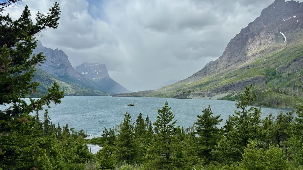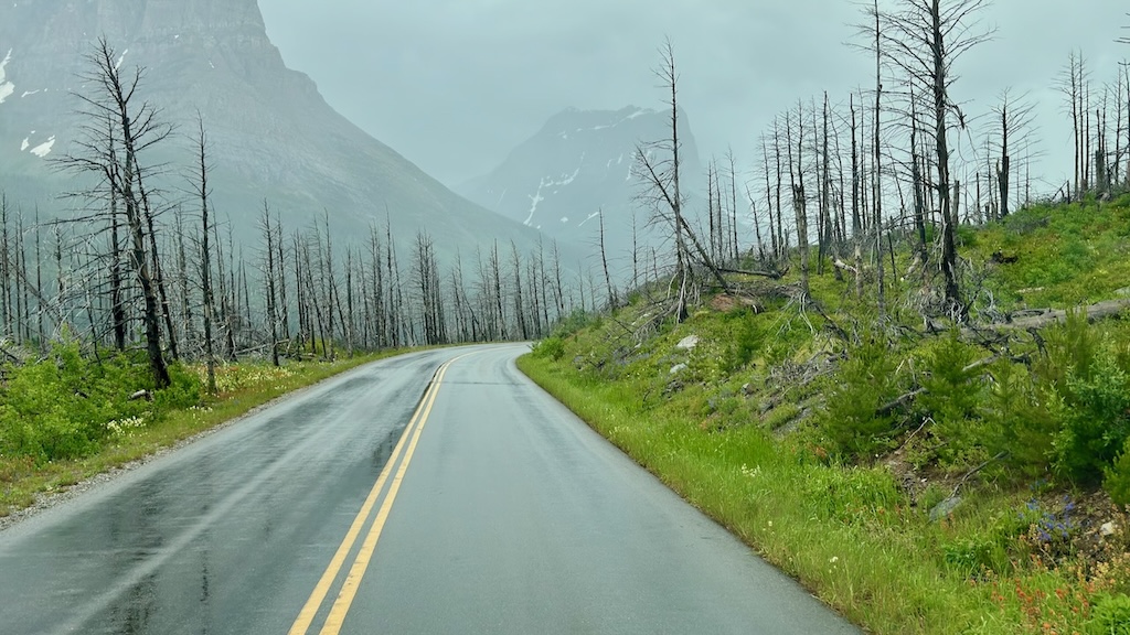 It started raining early in the morning and was raining when we woke up. We left camp a little after 6 am, hoping to arrive early and be able to get into the park without a reservation. We drove about 10 miles until we finally got internet access. We tried to get the reservations but found out the requirement for reservations didn’t apply to the East Glacier NP entrance, only the West entrance, so we didn’t need to be in such a hurry.