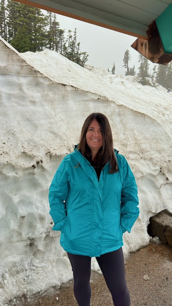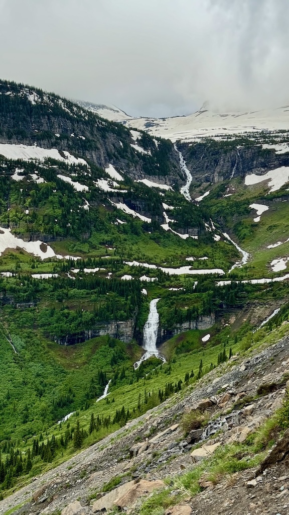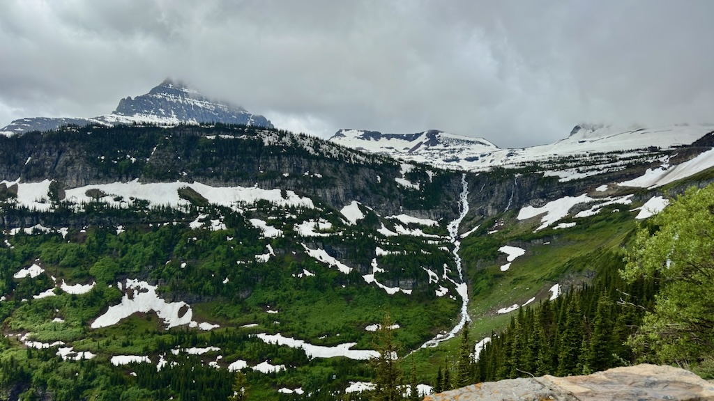The other reason we wanted to leave early was so we could stop at the visitor center at Logan Pass at the top of the Going to the Sun Road. Last time we visited, the parking lot was full, and we didn’t stop. This time there was plenty of parking because it was rainy, cold and we were in the clouds. The clouds did clear occasionally, and we were able to get a few pictures. The rain continued off and on for most of the day.