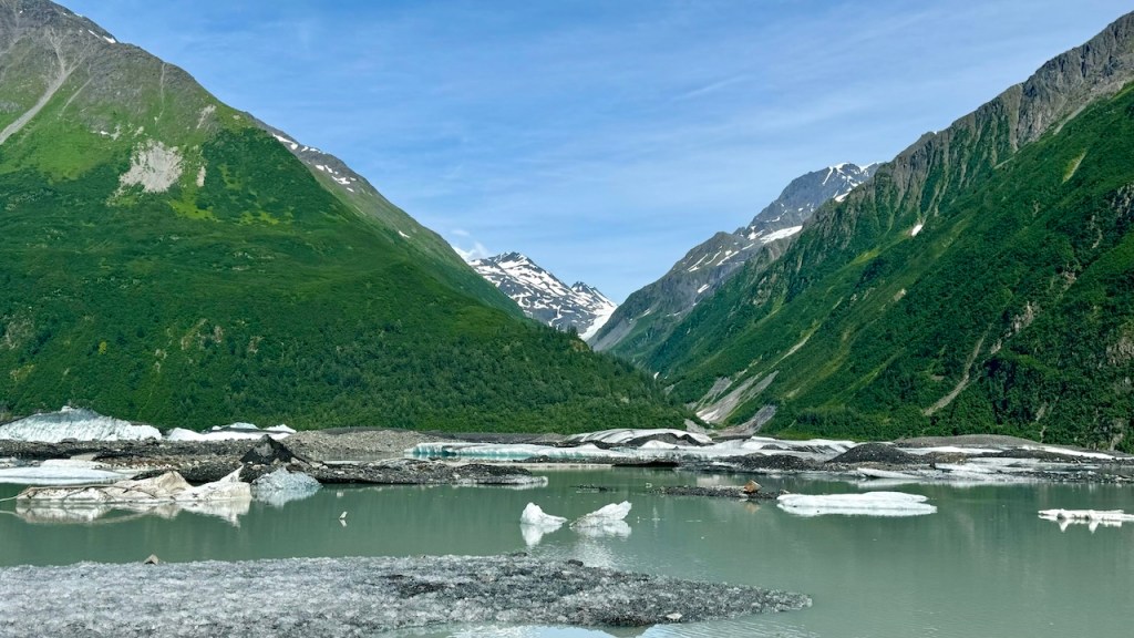 Later we drove to Valdez Glacier Lake. The glacier has receded around the mountain, but the glacier lake is full of icebergs. It’s not very pretty as the water looks muddy and most of the ice is covered with dirt and rocks, but it was interesting to see.
