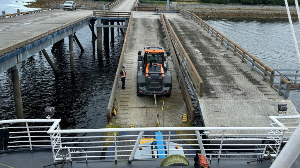 We were lucky because on Tuesdays the ferry takes a side trip to Tatitlek, a small island community a bit south of Valdez. Today they were just going to drop off a large boom lift machine. However, the machine did not have enough power to climb the ramp off the ferry. So they had to go back in town and get a front-end loader and use that to tow the lift out of the ferry. It delayed the ferry by 30-40 minutes, but it was a fun show to watch them try to get the machine out of the ferry.