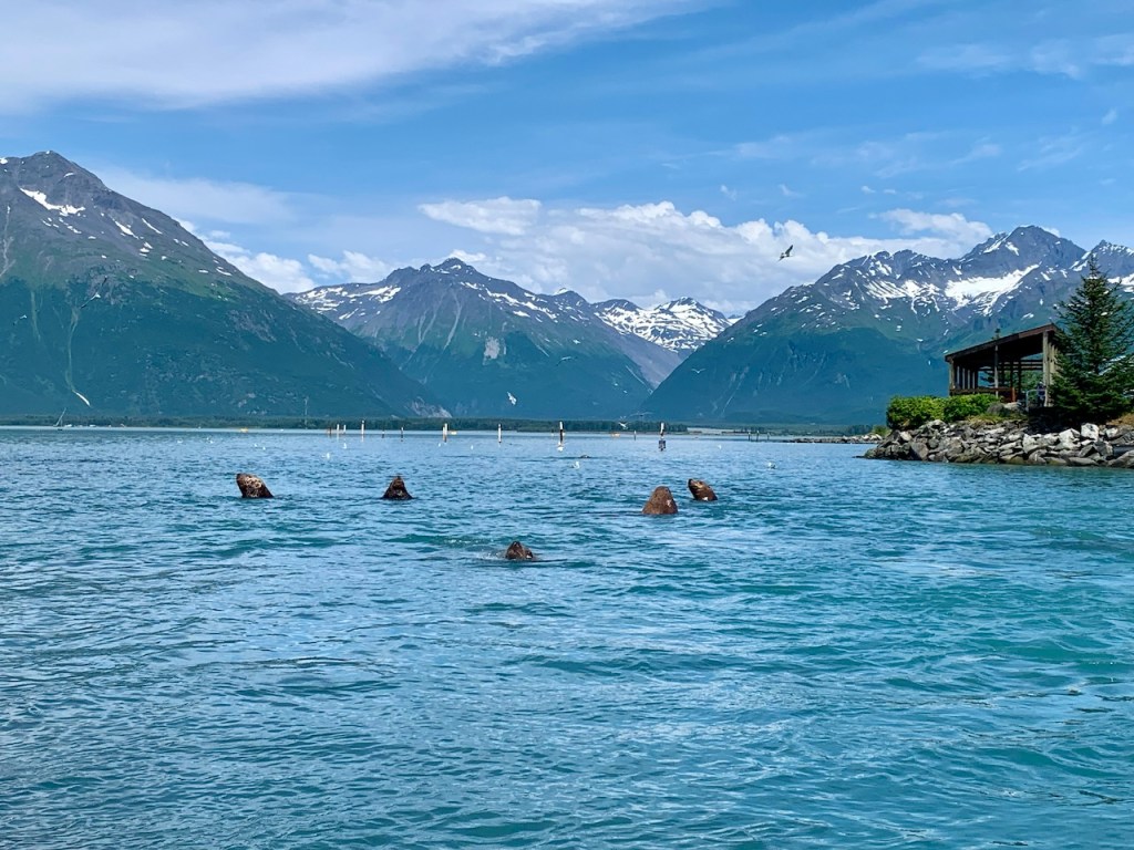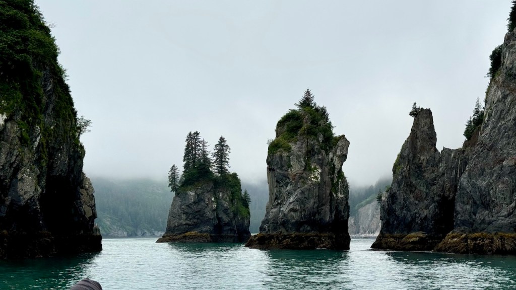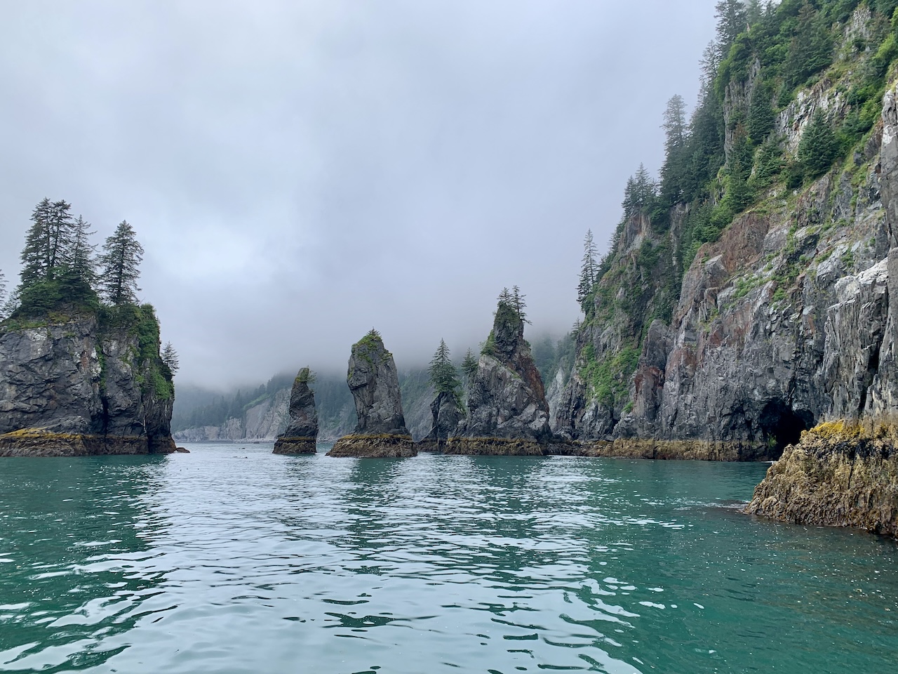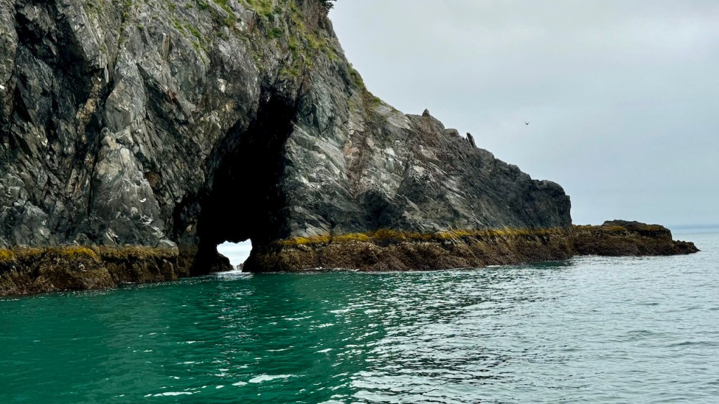 The weather looked okay when we left Seward, but on the water it was very foggy and for the first hour we had no visibility. It cleared up a bit and we saw a large pod of humpback whales doing what is called “bubble netting”. The group of whales submerge and start circling underwater, letting air out of their blowholes. This creates a cylinder of water with the net of bubbles surrounding it. This “bubble net” traps the small fish and then the whales move the net upwards, concentrating the fish on the surface. The whales then follow upwards with their mouths open, capturing mouthfuls of fish.