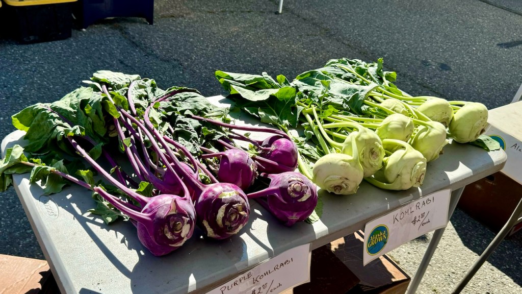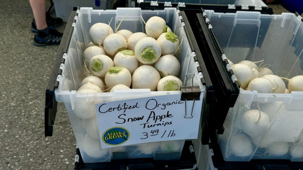 This was a real farmer’s market with 95% of the booths selling produce. They had several types of vegetables that we had never heard of. Anchorage is close to the Mat-Su valley, which is short for the Matanuska-Susitna Valley. This valley has very fertile soil and with the long summer sun, they grow a large variety of of very big vegetables. The farmer’s market was very interesting.