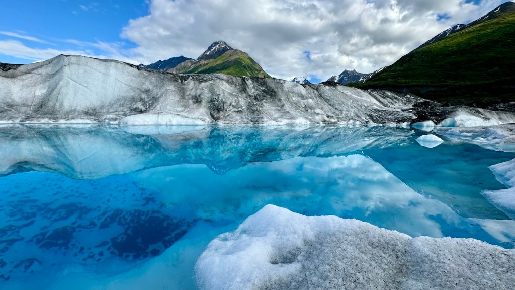 We loaded up again and flew over more mountain ridges and peak and landed on the Knik Glacier near a clear blue pool of water. We were able to walk around on the glacier and get some glacial water from the blue pools. We were lucky that we had a mostly sunny day with no wind. It was a beautiful day.