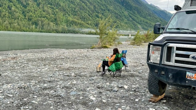 We arrived back at the lodge around 7 pm and we found a campsite along the Knik River by 7:30 pm. We ate our dinner on the riverbank with a fire in our firepit. A good end to a fun day.