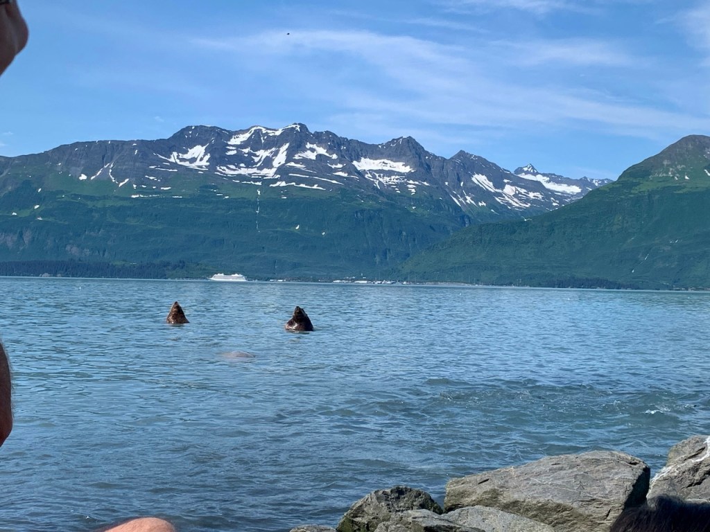 We were surprised and a little scared when we first saw the bear. When we have seen other bears, we were in the van or a bus. Or there was a large group of people. This time it was just us and the bear. I think these bears are used to ignoring people, but it was a shock to us. While walking back to camp we saw a seal in the river swimming around looking for fish.