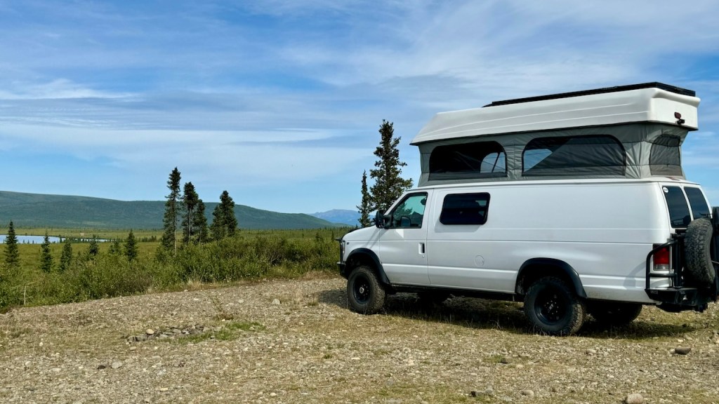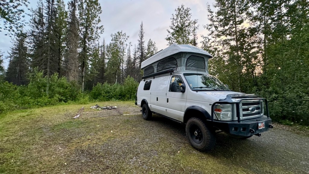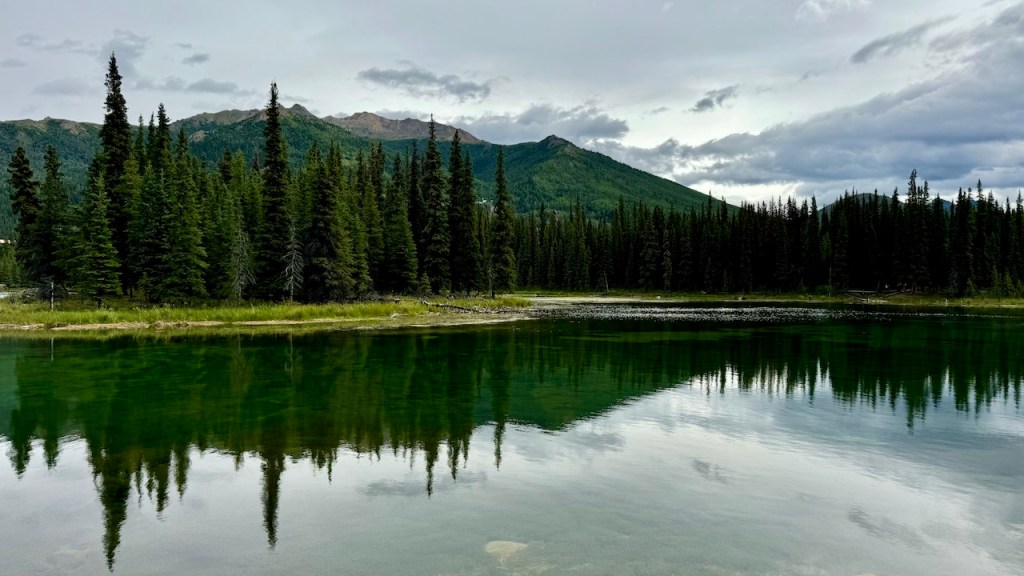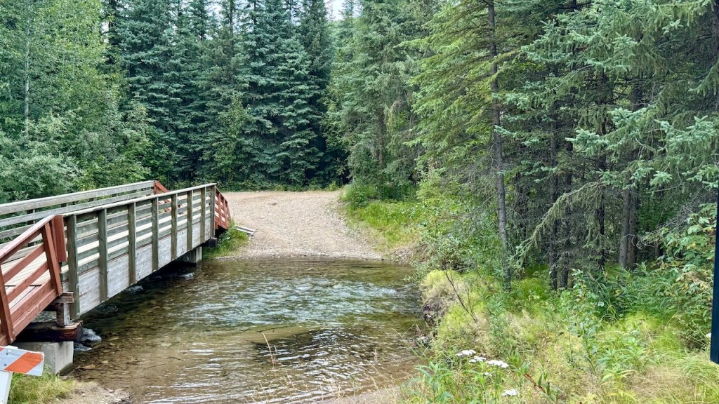 It was a rainy morning, and it rained most of the day. We left camp and drove in the rain to Delta Junction. We stopped in the visitor center, but it was raining so we didn’t stay in town long. We continued to Tok and stopped for gas. We then drove into Canada and camped alongside a river. Since it was overcast, the night got pretty dark and it was the quietest night we have had in a long time.