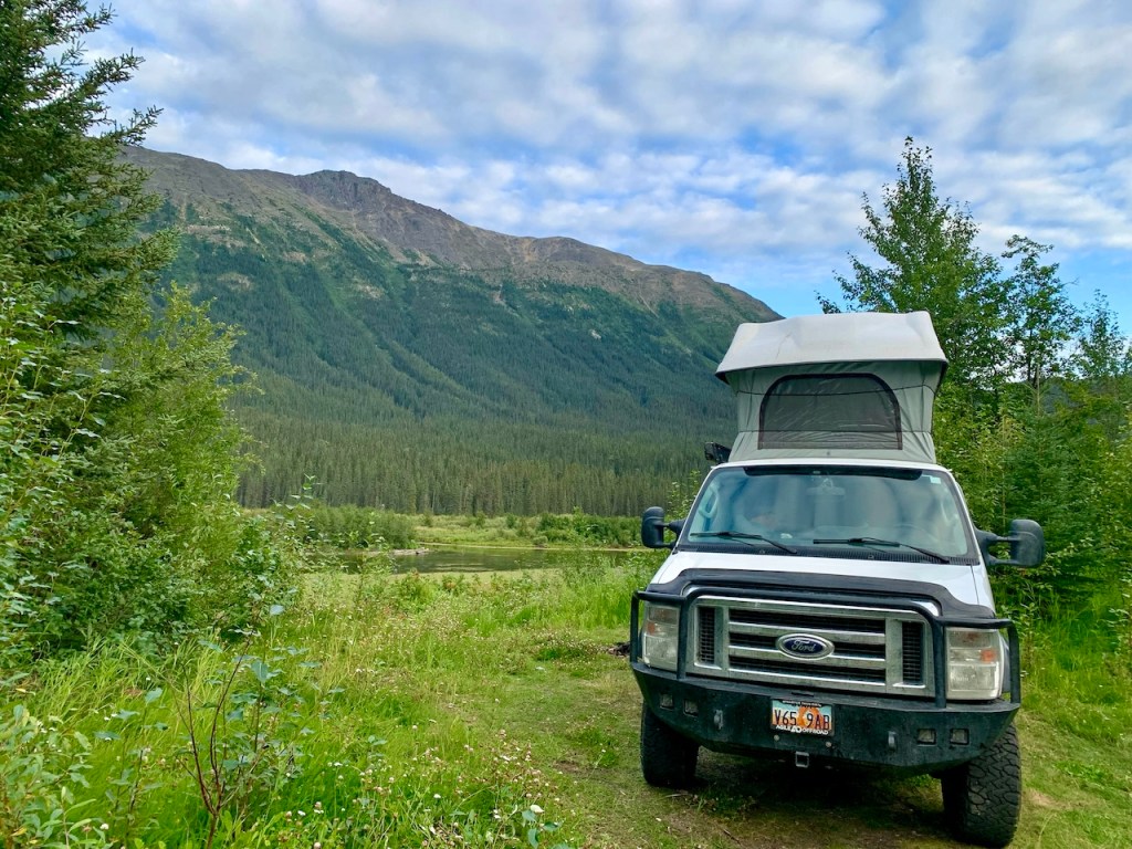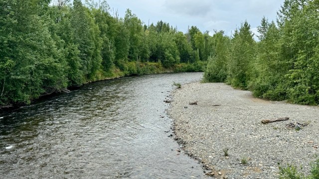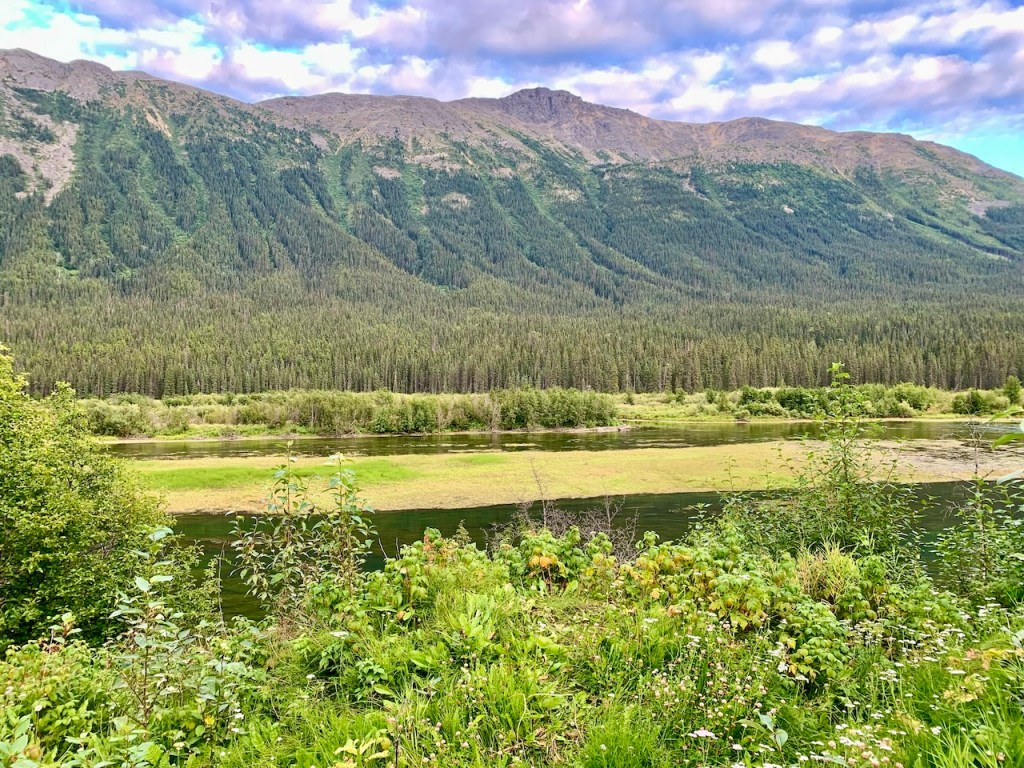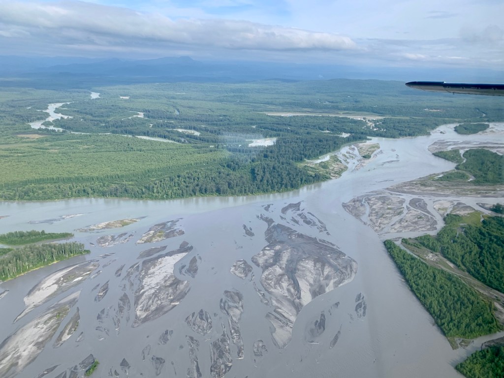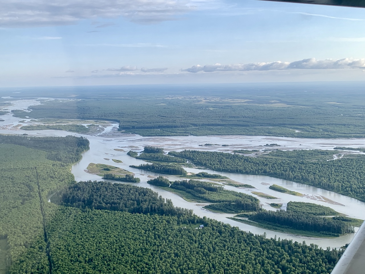The flight back to Talkeetna took about 20 minutes. After landing we said our goodbyes to the cousins. They were spending the night in Talkeetna before flying home the next day. Eva and I backtracked to the north towards Fairbanks. It was around 9 pm when we left Talkeetna, so we drove until 10:30 pm and camped near a river about 30 miles south of Cantwell.