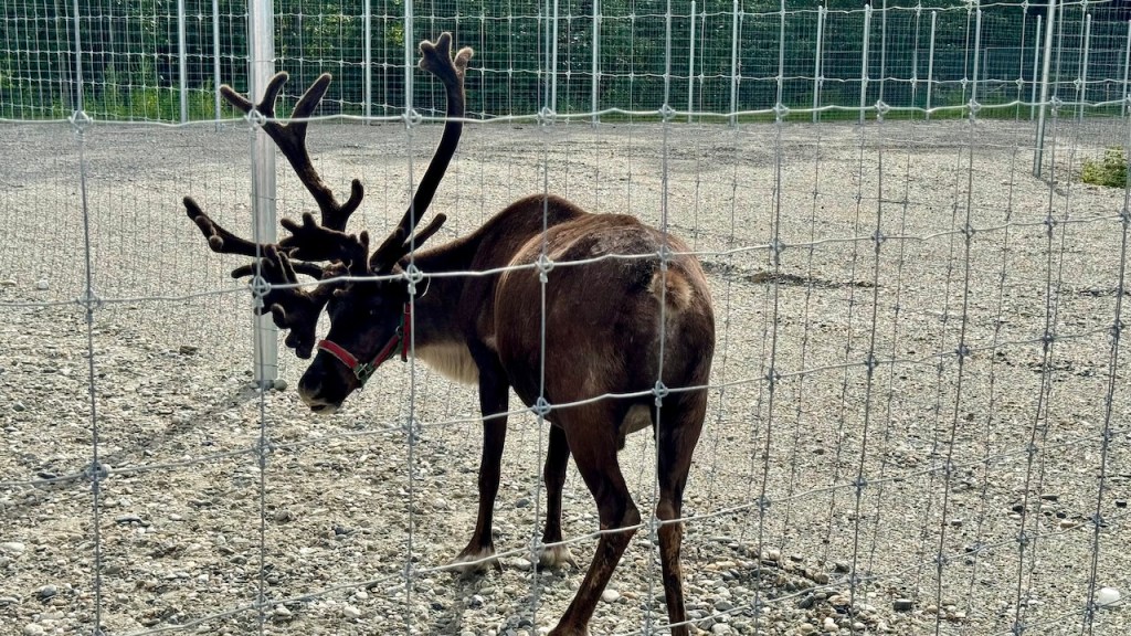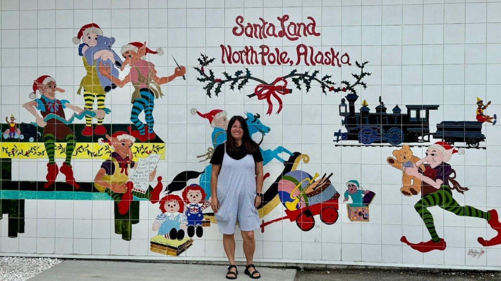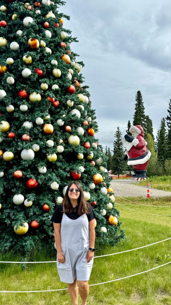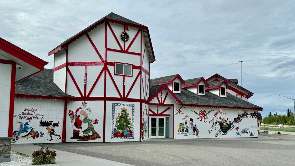 In the morning we drove from Chena Hot Springs back to Fairbanks to get the van tires rotated. It took longer than expected, but we left town about 2:30 pm and drove to North Pole, Alaska. This town is about 15 miles from Fairbanks and was started in the 1950’s with the expectation of toy companies putting manufacturing plants in the town and labeling the toys as being made at the North Pole. I don’t know if that worked out, but they do have Santa Claus’ house just off the highway. We stopped and looked around and visited the reindeers.