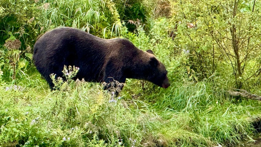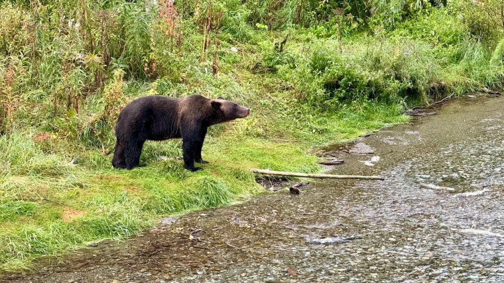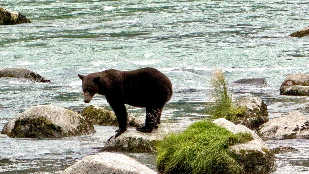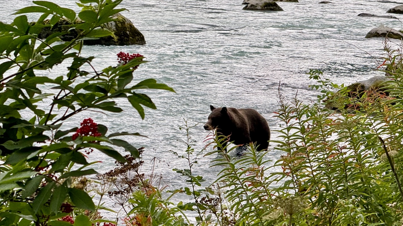 We watched the bear wander through the creek catching fish, and then taking the fish to the bank to eat. The bear was there for 30-45 minutes before it continued up the creek out of our sight. After taking pictures and videos we went back to the van as Eva was not feeling well.