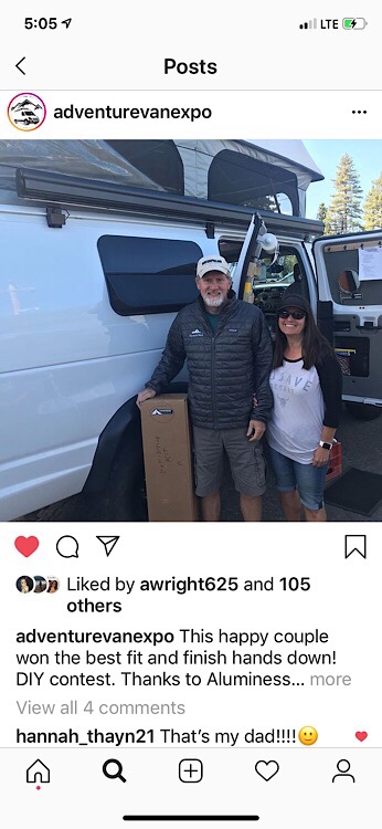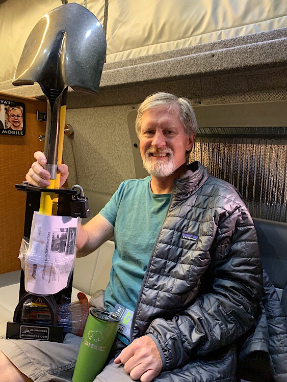 It took about an hour for the judges to come by, and then it was another hour before they announce the winners. We won the grand prize for the best finished van. The grand prize was an expedition kit from Aluminess. This is a shovel and ax kit with a mount and lock that mounts to the back of the van. It was something that I wanted to buy, but it costs $275 so I was not planning to buy it. So we were pretty glad that we won. I also won a Pantagonia puff jacket, a thermal cup and a couple of tee-shirts. Our van was well above the other vans on the contest so we would have been disappointed if we did not win.