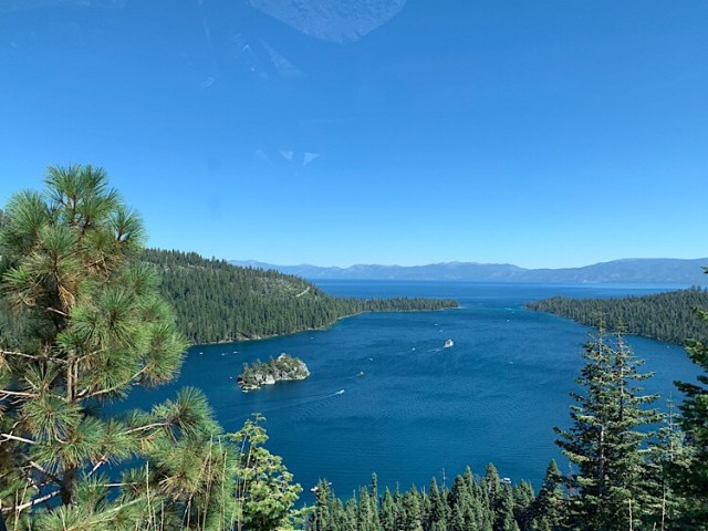 We were at the expo until about 6 pm. They had some free food, so we ate dinner there. On the way back to camp we stopped at Inspiration Point to overlook Emerald Bay on Lake Tahoe. On the way to Homewood in the morning the road was very crowded and all the parking areas were over-filled. Coming back in the evening there was a lot more space to park.