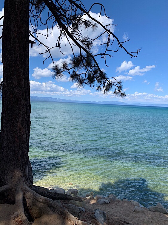 After church we changed and started heading north along the west side of Lake Tahoe. The road weaves up and down and back and forth along the shore line and sometimes high above the shoreline. It is very beautiful, and Eva was able to enjoy it. I was too busy trying to stay on the road and avoid all the traffic and bikers.