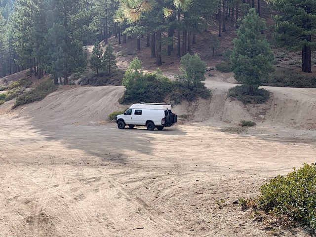 From Fallon it was probably 90 minutes to Carson City. This was close to the start of the Sierra Nevada mountains. We topped of the gas tank and continued about 30 more minutes up the mountains to the camping spot we had identified. This was a large sandy lot about 1.5 miles off the highway. We were there with 3 other RVs, but they stayed in their RV and we never saw any of them during the time we were there. Later we determined that we were camping in the middle of the Pondarosa Ranch, from the TV show Bonanza (if it were a real ranch).