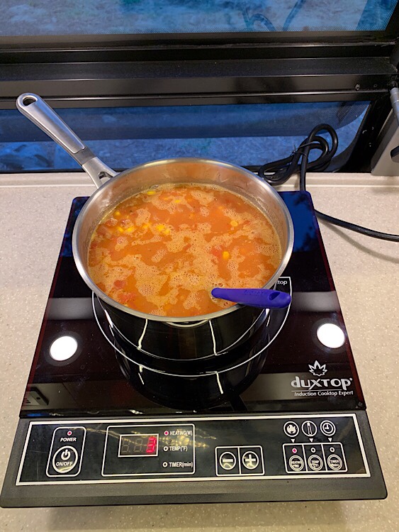 Back at camp we read and talked for a while. We took showers around 4 pm and then cooked dinner later in the evening. Eva made taco soup using the induction cooktop. It took about 10% of the battery power.