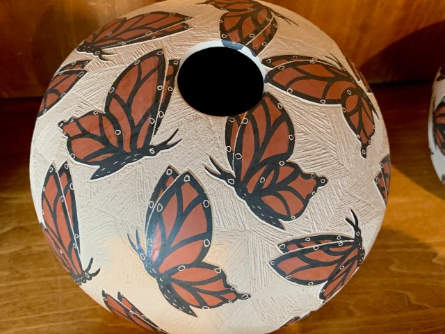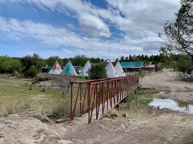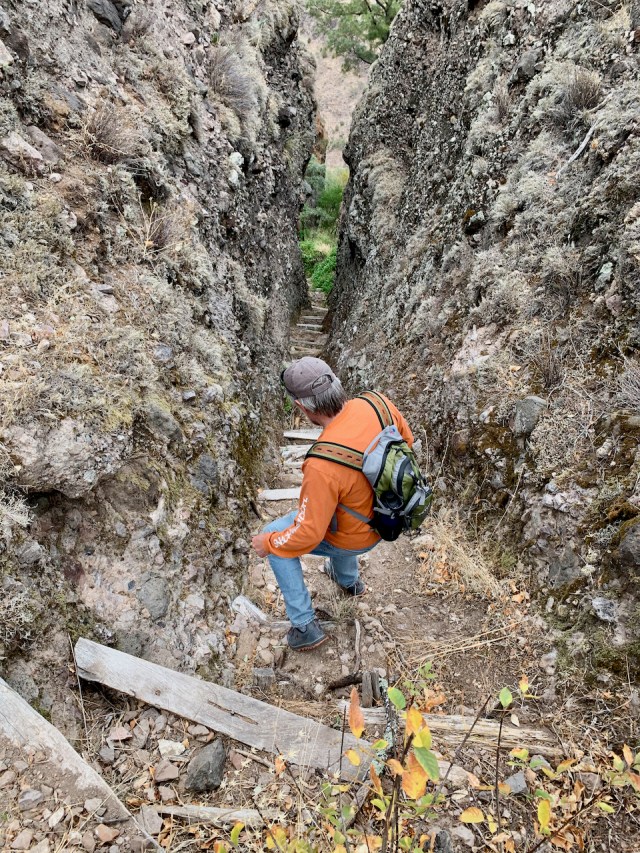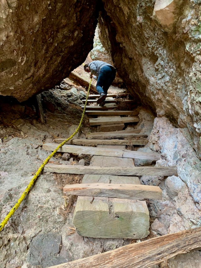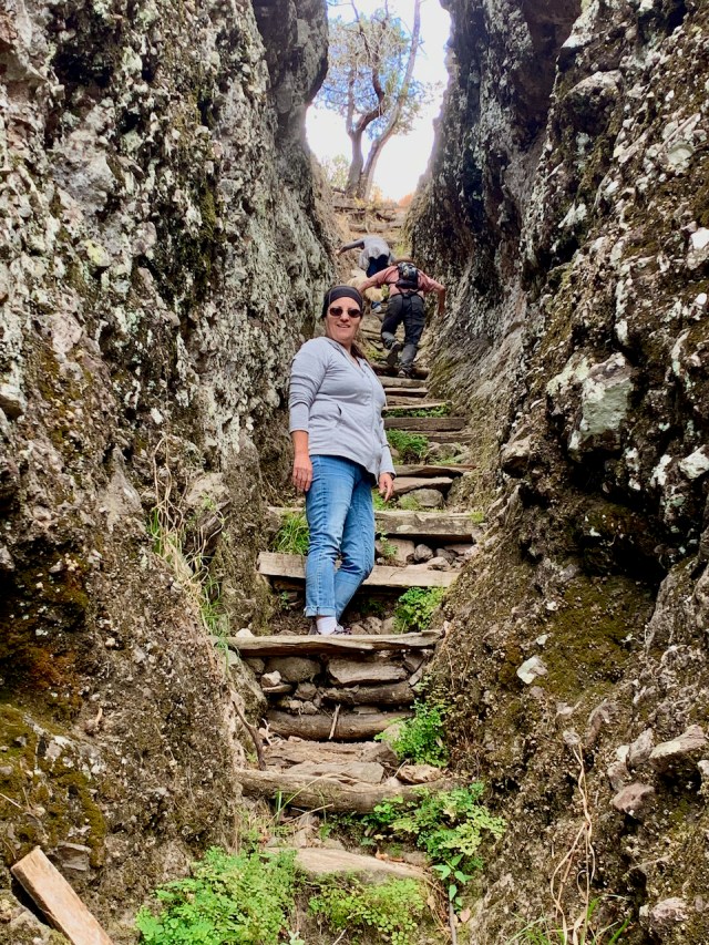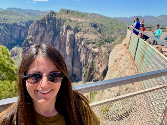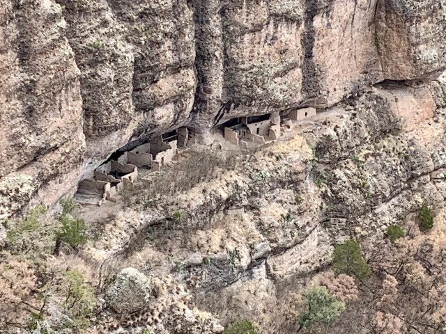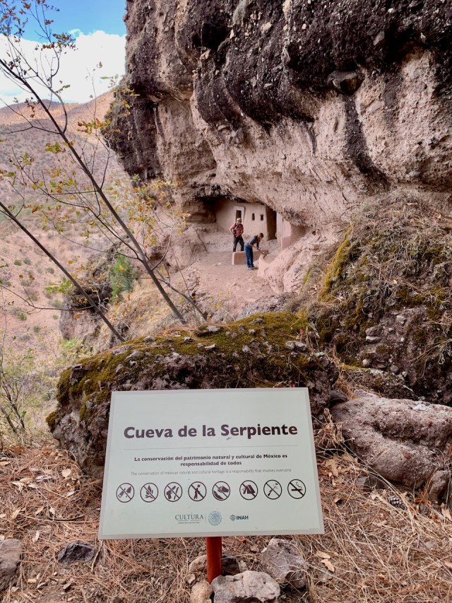 We were able to see cave dwellings, high on the cliffs, that are still used during the summer months by the Tarahumara people. We stopped at a small tiende (store), situated high on a cliff overlooking the river valley. We stopped for a view of the valley, but a young girl, maybe 12-13 years old, scrambled up and opened the store. It appeared that she lived at the store by herself. She had a small garden and an outhouse perched on the edge of the cliff that overlooked the switchbacks below. We bought a couple of baskets and snacks from her and Eva gave her a couple of fruit snacks.