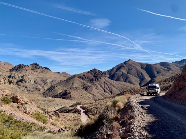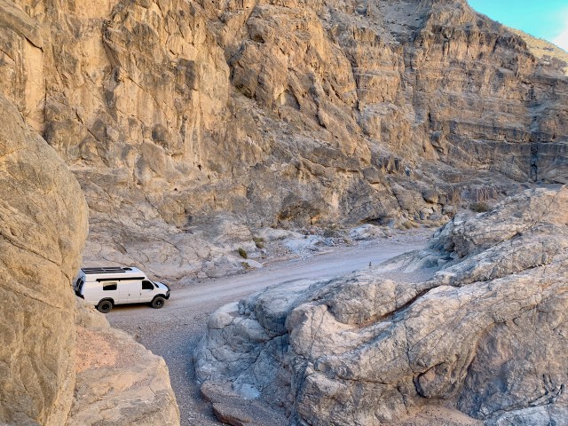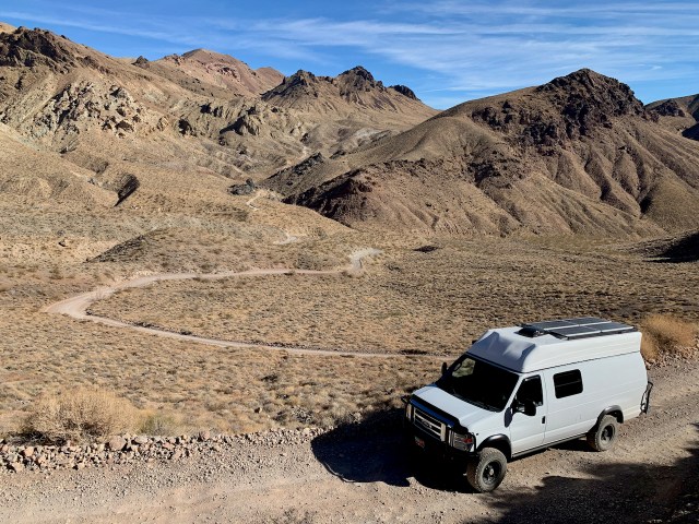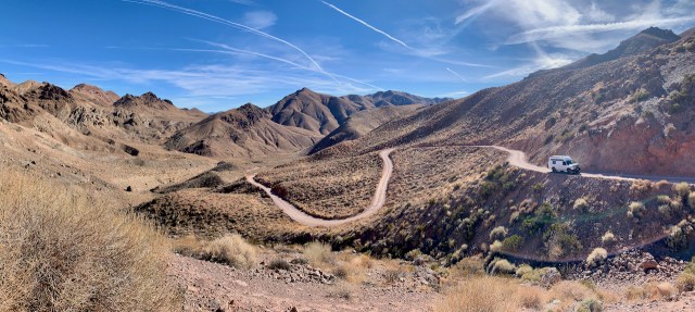 After leaving Rhyolite we started our way into Death Valley National Park. We weren’t entering on the main road, but planned on taking a back country route through Titus Canyon. Titus canyon is a 27 mile track across a mountain range. From the east you climb over one set of mountains into a mountain valley. This part of the trail was steep going up and steep going down. I put the van in 4×4 low, without locking the hubs, to creep down from the top of the mountain pass.