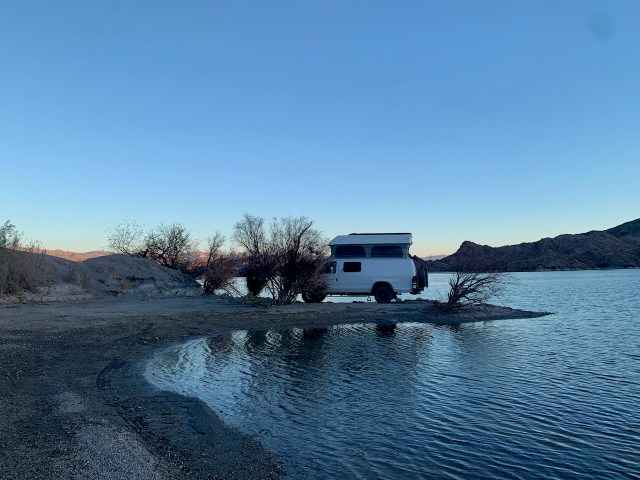 When we parked earlier that day, we were only about 3 feet from the waterline. Late that night we heard water lapping at the shore. It sounded real close. We peeked out the window and could see the water had risen up the shore about a foot. Now we understood why the ground under our camp was all wet. We thought we may have to move camp in the middle of the night. I checked online and read that Lake Mead increases water output each night. This raises Lake Mohave about 3-4 inches, which at our site was about 1-2 feet up the shoreline. The water then recedes in the morning.